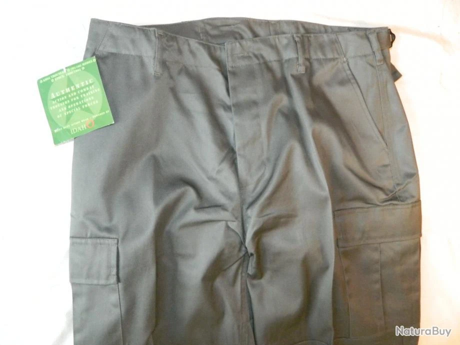 Pantalon de chasse kaki de marque IDAHO, 35% coton 65% polyester. 2 poches mains, 2 poches cargo et 2 poches arrières; cordon de serrage en bas des jambes, sangles de serrage à la taille, renforts aux fesses et aux genoux. Taille 50.