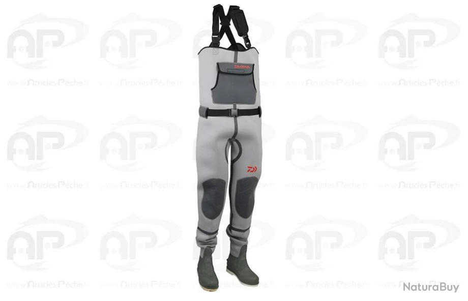 Ce waders de qualité est conçu en toile néoprène Cr 4 mm ultra-souple et très confortable pour faciliter les déplacements. C’est un des rares modèles qui monte jusque sous les bras, pour limiter les risques d’entrée d’eau, notamment lors de l’immersion en mer face aux vagues. Les bottes sont équipées de semelles mixtes feutre et talon caoutchouc à crampons. Il est doté de renforts aux genoux et aux tibias et les coutures sont renforcées : cousues, collées et soudées. Les bretelles sont réglables à déverrouillage instantané. La ceinture à clips permet un serrage rapide de la taille.